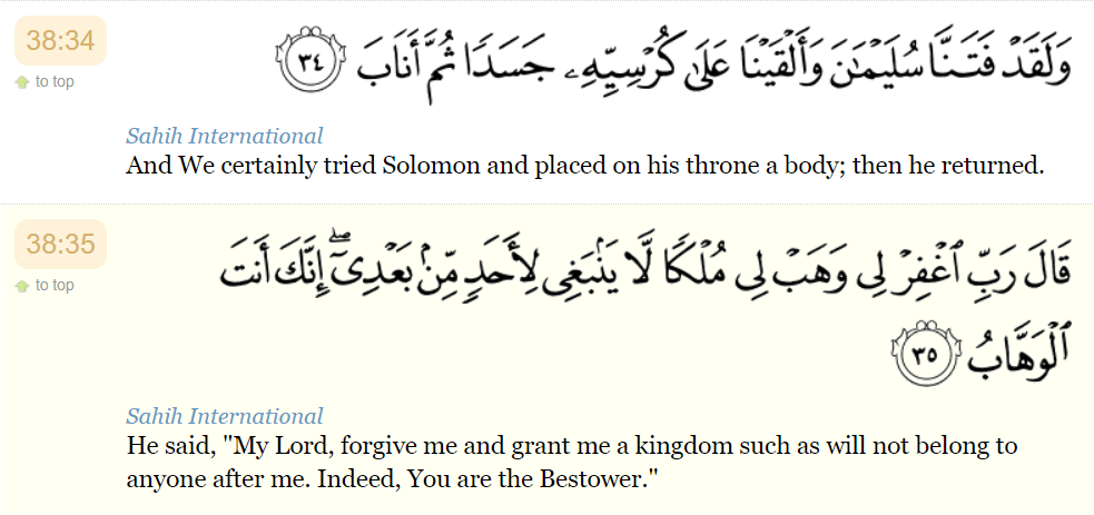 The second section of them says that a son was born to the Prophet Solomon after twenty years. The satans feared that if he became king after Solomon, they would continue to remain slaves as they were under him. Therefore, they plotted to kill him. When Solomon came to know of this plot, he hid the child in the clouds so that he was brought up there. This was the temptation in which he was involved: he placed reliance on the protection of the clouds instead of having trust in Allah. For this he was punished in this way that the child died and fell on his throne as a mere body …. This tale also is baseless and is expressly against the Qur`an, for in this also it has been assumed that the winds and satans were already under the Prophet Solomon’s control, whereas the Qur’an in clear words has stated their subjection to be an event that took place after the trial.