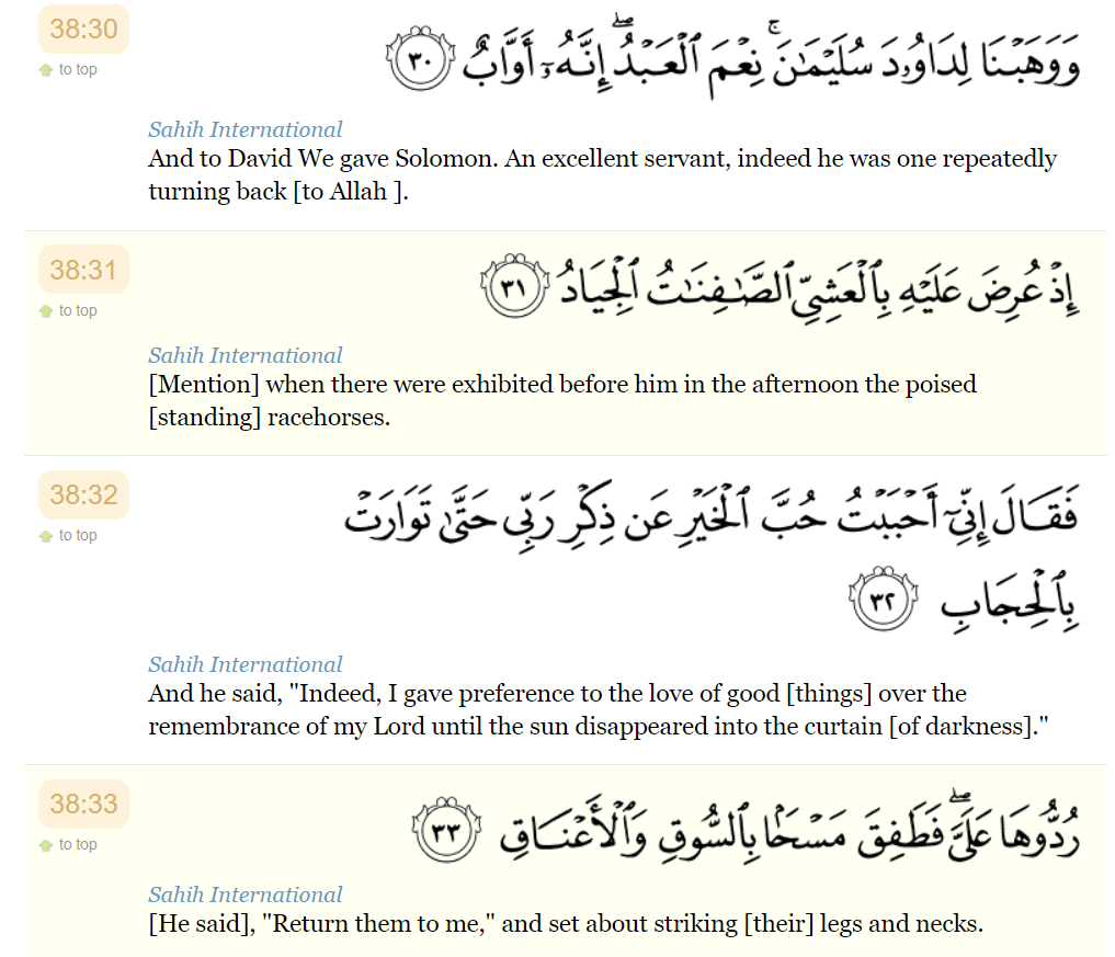 The third section of the commentators interprets these verses as any unbiased person would interpret them from these words. According to this commentary, what actually happened was this: When a squadron of fine, well bred horses was presented before the Prophet Solomon, he said: “I love this wealth not for the sake of personal glory or desire but for the cause of raising the Word of my Lord.” Then he ordered that the horses run a race, and they disappeared from sight. Then he ordered that they be brought back, and when they were brought back, according to Ibn `Abbas: “He started passing his hand on their necks and shanks with love.” This same commentary is correct in our opinion, because it corresponds to the words of the Qur’an, and for the sake of the full meaning, nothing needs to be added to it, which may neither be in the Qur’an, nor in any authentic Hadith, nor in the Israelite history.