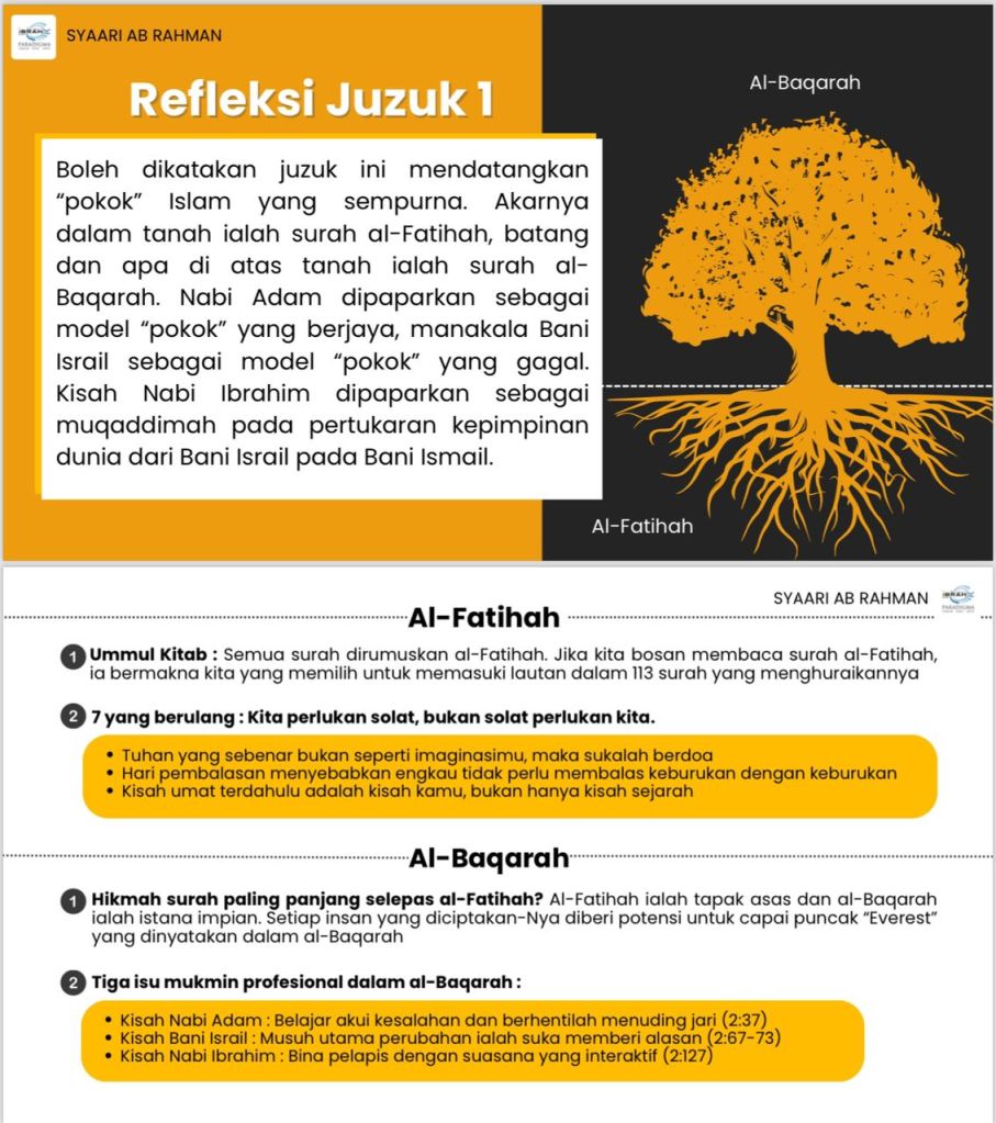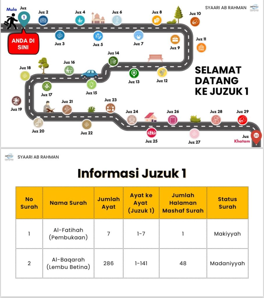 Saya akan merujuk beberapa karya selain Kompas 114 dan Sinopsis Juzuk terbitan Tadabbur Centre. Antaranya Nuran Mubina tulisan Shekhuna Ustaz Abdullah Bukhari al-Hafiz, Fainni Qarib tulisan Fakhri Fadzli, Catatan Refleksi 30 Juzul al-Quran tulisan Hafizul Faiz, A Juz A Day tulisan Yahya Ibrahim, dan Hidayat al-Ajza’ tulisan Prof. Dr. Umar Abdullah al-Muqbil.