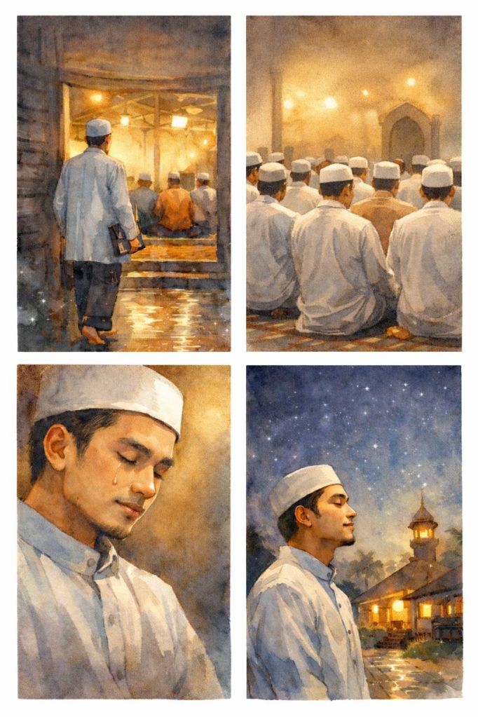 Selepas Isyak, Muaz melangkah ke surau kayu hujung simpang. Lampu kekuningan memantul pada wajah jiran-jiran yang lama tak dia jumpa. Suara budak-budak hilang perlahan bila saf mula rapat. Imam kampungnya naik dengan tenang, dan tarawih pun bermula seperti biasa dua puluh rakaat, ringkas, tidak memaksa.