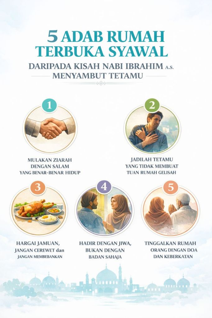 Muka letih, adab longgar, tangan sibuk dengan telefon, lalu ruh ziarah itu hilang. Rumah terbuka yang diberkati ialah rumah yang dimasuki dengan doa dan wajah yang menenangkan.